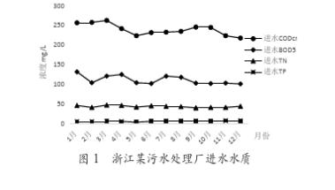 圖1是浙江某污水處理廠的2017年進(jìn)水水質(zhì)。通過分析,全年進(jìn)水COD平均值為240 mg/L,進(jìn)水BOD為111 mg/L,進(jìn)水總氮為43 mg/L,總磷為5.78 mg/L。來水中BOD/COD=0.46/0.45,通過可生化性分析,該進(jìn)水屬于易生化廢水。碳氮比分析中,BOD/TN=2.58;而在日常分析中,碳氮比低至2.0~2.1;相關(guān)研究表明,碳氮比在4~5時(shí),才能有較好的脫氮除磷效果。通過以上分析,本廠的進(jìn)水雖然易生化,但是碳氮比較低,特別是在進(jìn)水碳源較低的情況下,低碳源對(duì)于出水穩(wěn)定達(dá)標(biāo)造成一定的風(fēng)險(xiǎn),因此需要外加碳源作為進(jìn)水碳源的補(bǔ)充。