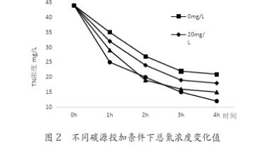 如圖2表示,葡萄糖作為外加碳源,在投加量分別為0、20mg/L、40mg/L和80mg/L情況下,總氮隨時(shí)間的變化值。總氮隨反應(yīng)時(shí)間的延長,濃度逐漸降低,最終出水濃度分別為21mg/L、18mg/L、15mg/L和12mg/L。在投加碳源后,系統(tǒng)對(duì)脫氮的效果有所提升,對(duì)總氮的去除率分別為52%、59%、66%和73%。投加碳源達(dá)到20mg/L后出水滿足《城鎮(zhèn)污水處理廠污染物排放標(biāo)準(zhǔn)》GB18918-2002中的一級(jí)B標(biāo)準(zhǔn),而且隨著投加量的增加,系統(tǒng)對(duì)總氮的處理效果增強(qiáng)。實(shí)驗(yàn)表明:碳源的投加,保證了硝化細(xì)菌,特別是異養(yǎng)型反硝化細(xì)菌對(duì)碳源的需求,提高的脫氮的效果。