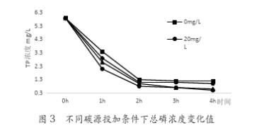 如圖3表示,葡萄糖作為外加碳源,在投加量分別為0、20mg/L、40mg/L和80mg/L情況下,總磷隨時(shí)間的變化值。總磷隨反應(yīng)時(shí)間的延長,濃度逐漸降低,最終出水濃度分別為1.2mg/L、1.0mg/L、0.6mg/L和0.5mg/L。在投加碳源后,系統(tǒng)對(duì)除磷的效果有所提升,對(duì)總磷的去除率分別為80%、83%、90%和92%。投加碳源達(dá)到20mg/L后,出水均滿足一級(jí)B標(biāo)準(zhǔn),而且隨著投加量的增加,系統(tǒng)對(duì)總磷的處理效果增強(qiáng)。