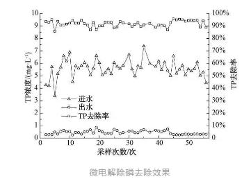微電解除磷去除效果如下圖所示, 進(jìn)水 TP 濃度為3.5~7 mg/L,平均濃度為5.64 mg/L。當(dāng)進(jìn)水TP濃度為3.5~5 mg/L時(shí),出水TP濃度穩(wěn)定于0.5 mg/L以下,達(dá)到一級(jí)A標(biāo)準(zhǔn);當(dāng)進(jìn)水TP濃度在5~7 mg/L時(shí),出水TP濃度穩(wěn)定小于1 mg/L,達(dá)一級(jí)B標(biāo)準(zhǔn);平均去除率為91.84%~95%。項(xiàng)目試驗(yàn)結(jié)果表明,微電解除磷-砂濾技術(shù)可有穩(wěn)定高效的除磷效果,出水TP穩(wěn)定達(dá)標(biāo)。