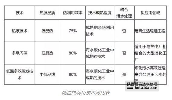 如低溫熱利用技術(shù)對比表所示,較常規(guī)熱泵技術(shù)和多級閃蒸技術(shù),低溫多效蒸發(fā)在熱利用率、技術(shù)工藝耦合污水處理等方面具有明顯優(yōu)勢,代表了相關技術(shù)領域的發(fā)展方向,是開展余熱利用和污水處理耦合技術(shù)的重點方向。