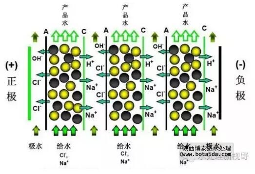 EDI膜堆主要由交替排列的陽離子交換膜、濃水室、陰離子交換膜、淡水室和正、負(fù)電極組成。離子交換樹脂充夾在陰陽離子交換膜之間形成單個處理單元,并構(gòu)成淡水室,單元與單元之間用網(wǎng)狀物隔開,形成濃水室。在直流電場的作用下,淡水室中離子交換樹脂中的陽離子和陰離子沿樹脂和膜構(gòu)成的通道分別向負(fù)極和正極方向遷移,陽離子透過陽離子交換膜,陰離子透過陰離子交換膜,分別進(jìn)入濃水室形成濃水。同時EDI進(jìn)水中的陽離子和陰離子跟離子交換樹脂中的氫離子和氫氧根離子交換,形成超純水(高純水)。超極限電流使水電解產(chǎn)生的大量氫離子和氫氧根離子對離子交換樹脂進(jìn)行連續(xù)的再生。傳統(tǒng)的離子交換,離子交換樹脂飽和后需要化學(xué)間歇再生。而EDI膜堆中的樹脂通過水的電解連續(xù)再生,工作是連續(xù)的,不需要酸堿化學(xué)再生。