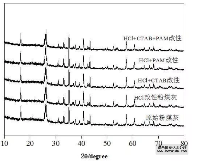 上圖為原始粉煤灰及改性粉煤灰的XRD譜圖。由圖可知,原始粉煤灰的X射線衍射譜圖與經(jīng)過改性的粉煤灰的X射線衍射譜圖相比,特征峰位置基本不變,這與粉煤灰是在高溫下形成的有很大關(guān)系,其在高溫下形成玻璃體結(jié)構(gòu)和組成成分很難改變。SiO2的特征衍射峰在26°附近,Al2O3的特征衍射峰在43°附近,Ca(OH)2的特征衍射峰在32°附近,峰面積與其含量有關(guān),含量越高,峰面積越大。由圖可知,SiO2的特征峰基本不變,說明粉煤灰的基本玻璃體結(jié)構(gòu)大部分未被破壞。Al2O3和Ca(OH)2的特征衍射峰值略微減少,說明HCl改性使其溶出,增大了粉煤灰的表面粗糙度,增加了吸附位點,這與SEM圖表征結(jié)果一致。粉煤灰中玻璃體的含量可以由XRD圖譜上有許多分散的細小峰包的峰面積和峰范圍大小相對表示,由圖可得,粉煤灰的衍射強度降低,改性粉煤灰的峰包面積小于原始粉煤灰,說明改性過后的玻璃體結(jié)構(gòu)部分被破壞。