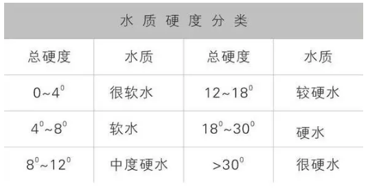 水的硬度,是指水中的鈣、鎂、鐵、鋁、錳的碳酸鹽、重碳酸鹽、氯化物、硫酸鹽及硝酸鹽等所有的鹽類的含量,并常含有汞、鎘、砷、鉛等少量的有害元素。水的硬度單位通常是將水中的全部鹽類換算為碳酸鈣來(lái)計(jì)量。當(dāng)水中的硬度以碳酸鈣計(jì)小于150毫克/升時(shí),稱為軟水;150—450毫克/升時(shí),稱為硬水;450—714毫克/升時(shí)為高硬水;大于714毫克/升時(shí)為特硬水。國(guó)家生活飲用水硬度的衛(wèi)生標(biāo)準(zhǔn)為小于450毫克/升(以碳酸鈣計(jì))。